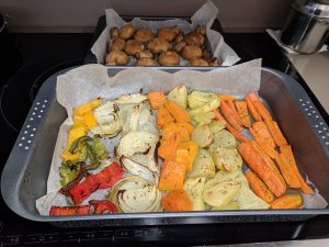 Otro “truquillo” que estoy utilizando para facilitar las comidas semanales  es el Batch Cooking. Esto consiste en dedicar un tiempo el fin de semana (o una tarde) a cocinar varias comidas para guardar y utilizar el resto de la semana. Así por ejemplo preparo una buena cantidad  de crema de verduras, que luego sólo tengo que calentar o cocino verduras al vapor para luego saltear según me apetezca. También he cocinado verduras al horno para luego utilizar según conveniencia: