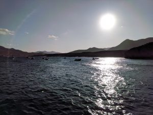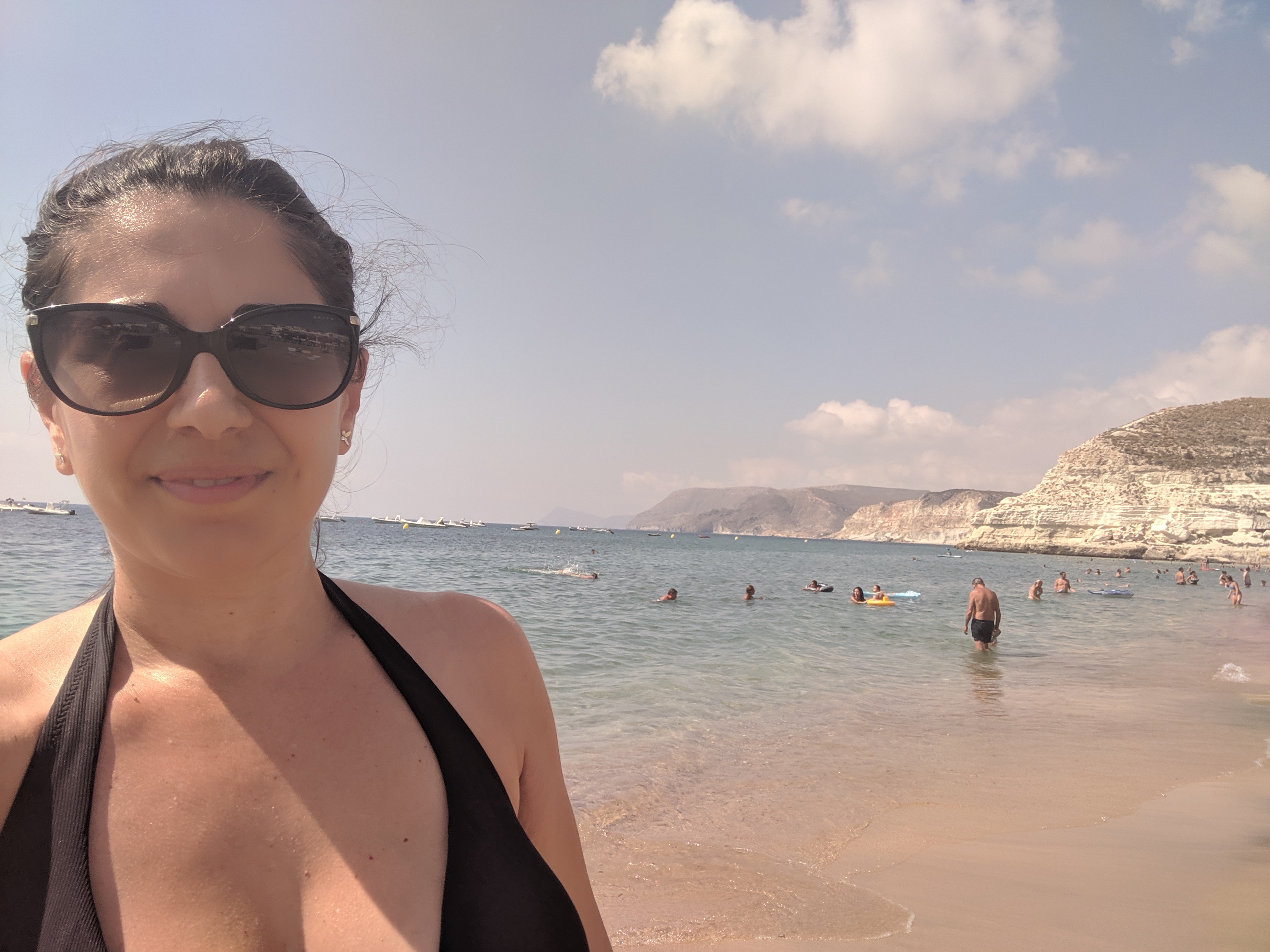 En la búsqueda de otro restaurante , tras preguntar en varios que estaban completos y ya poniéndonos algo nerviosos, realizamos una maniobra en la que se nos quedó encallado el coche en la arena, al lado de la carretera (parece ser que esto es habitual 😅….). Unos chicos muy majos intentaron ayudarnos a sacar el coche pero nada, tuvo que venir la grúa. Total que de esta manera el destino eligió que pasáramos el resto del día en esa playa, que está entre la Iglesia de las Salinas y La Fabriquilla, de pequeñas piedras. Para un primer contacto nada mal la verdad…